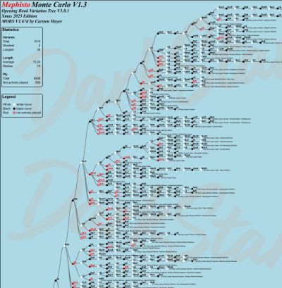 - Die Eröffnungsbibliothek des Monte Carlo (V1.2 und V1.3) ist 100% identisch mit dem des Mephisto Super Mondial (V 1b).