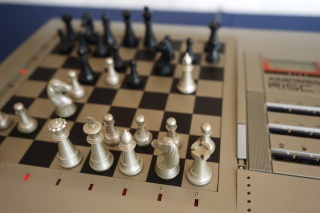 | Engine The King 1.99, unterschiedliche Spielstile auswählbar (normal, activ, offensiv, solide, defensive). Bekannte Programmversionen sind 1.02, 1.03 und 1.04, wobei zwischen Version 1.03 und 1.04 nur ein Zeitraum von einer Woche liegt, was auf ein kurzfristiges Bugfixing hindeutet. Infos zur Version sowie RAM/ROM Größe sind nach dem Einschalten im Startdisplay mit den den Cursortasten "links" und "rechts" abrufbar. Der RISC 2500 ist quasi baugleich zum später erschienenen Mephisto Montreux. | ||