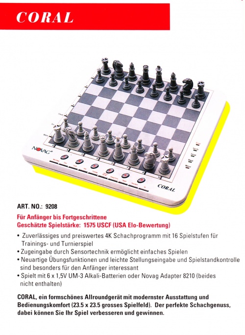 | Stromversorgung | Batterie, Netz = Novag 8210 | ||