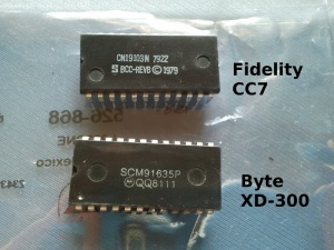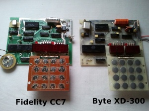 | An analysis of the XD-300 revealed what it seems to be a clone of the Fidelity Chess Challenger 7. There are some minor differences, for example, the pads between the keypad and the sensors underneath the board are very different giving a different feeling when you press the keys. Not better or worse, just different. Also, it uses a true speaker instead of a piezo beeper as in the Fidelity Chess Challenger 7. But the hardware architecture is the same, and the content of the ROM is identical. |