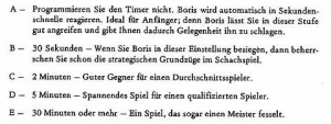 Prozessor: F8, 1 MHz, 8 Bit Speicher: 2.5 KB ROM, 256 Byte RAM Bibliothek: Programmierer: ? Elo: 1267 Stellungstests: ---- Colditz, ---- BT-2450 Verwandt: Zugeingabe: Tastatur Zugausgabe: 8-stellige 16-Segment LED Anzeige Stromversorgung: Netz = Spielstufen: Zeitvorgabe von 1 sec .. 100 h Maße (BxTxH): Sonstiges: Zufallsgesteuerte Kommentare