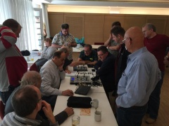 Das D.A.CH-Turnier war wieder eine rundum gelungene Veranstaltung. Angefangen vom sehr guten Essen und Trinken bis zum angeregten Fachsimpeln rund um das Thema Computerschach. Wie immer stand nicht das "Gewinnen müssen" im Vordergrund, sondern vielmehr der Spielspaß und der gegenseitige Informationsaustausch. In den letzten Jahren fand das Turnier jeweils immer am letzten Oktoberwochenende statt. Das hatte zudem den Vorteil, dass die Umstellung von Sommer- auf Winterzeit den Teilnehmern eine Stunde mehr Schlaf gönnte, welcher aufgrund der langen Nächte dringend von Nöten war. Auch Schachfreund Günther Steinmüller war wieder mit an Bord, dieses mal aber nur als Beobacher. Bei der ein oder andere Partie trug er mit seinen fachkundigen, teils recht trockenen Kommentaren zur allgemeinen Erheiterung der Teilnehmer bei. An dieser Stelle auch ein herzliches Dankeschön an Kurt für die Spende der imposanten Siegerpokale und an Robert für die souveräne Leitung des Turniers! Gleichzeitig war es für alle Teilnehmer eine besondere Freude, ein altbekanntes Gesicht wieder begrüßen zu dürfen: Franz Wagner aus München konnte aufgrund gesundheitlicher Probleme in den letzten Jahren nicht an den D.A.CH.-Turnieren teilnehmen. Jeder konnte aus seinen Augen regelrecht die Begeisterung sehen, wieder im Kreis der Schachcomputerenthusiasten angekommen zu sein. Wir alle würden uns auf ein Wiedersehen mit Dir in 2017 sehr freuen, lieber Franz!
