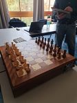 Ursprünglich sollte dieses Modul durch Marcus Kästner bedient werden und Alexander wollte als Zuschauer an dem Turnier teilnehmen. Da Marcus aus familiären Gründen seine Teilnahme absagen musste, wurde dies vertretungsweise von ihm übernommen. Als „Neuling“ war Alexander so freundlich, mir ein paar Zeilen zu seiner Person zu schreiben und hier zu veröffentlichen: Beruflich ist er im Projektmanagement und in der Softwareentwicklung an der Universität Trier als Informationselektroniker tätig. Darüber hinaus ist er Dipl. Psychologe. Zum Computerschach ist er in den 80er Jahren gekommen. In der Jugend war er als Vereinsspieler aktiv. Sein erster Schachcomputer war ein Chess Champion MK I. Bis heute hat er ein Faible für Holzgeräte. Zur Entwicklungsgeschichte des PiPhisto Moduls: Es handelt sich um einen Eigenbau, welcher seit Ende 2018 in Entwicklung ist. Dahinter steckt folgende Idee: auf alten Mephisto-Brettern (Modular, Exclusive, München) moderne Engines spielen lassen. Das PiPhisto beinhaltet die UCI Engine des CT 800 Battle+ mit der Vorjahres-Version 1.44, mit dem Marcus in Kaufbeuren 2022 gespielt hat. Das Programm läuft auf einem Raspberry Pi Minicomputer. Der CT 800 in der PiPhisto Version kann sämtliche CPU-Geschwindigkeiten emulieren. Für jeden historischen Oldie – Prozessor (6502, 68000, 68020er, M4 Prozessor etc.) kann somit eine eigenen Geschwindigkeit emuliert werden. Für das Turnier wurde die Geschwindigkeit auf einen Cortex M 4 mit 120 MHz eingestellt wie beim Original CT 800 von Rasmus.