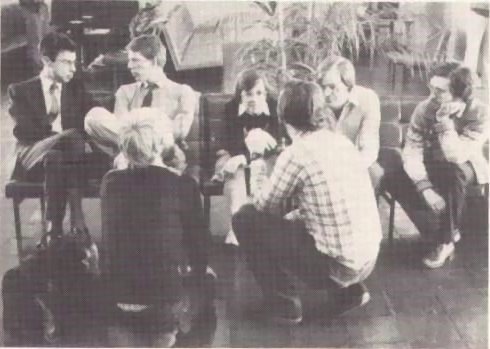 Programm-Autoren diskutieren zwischen den Runden. Von links sitzend: David Levy, Thomas Nitsche, Kathe Spracklen, Elmar Henne, Dieter Steinwender; vorne knied: Kaare Danielsen und David Kittinger.
